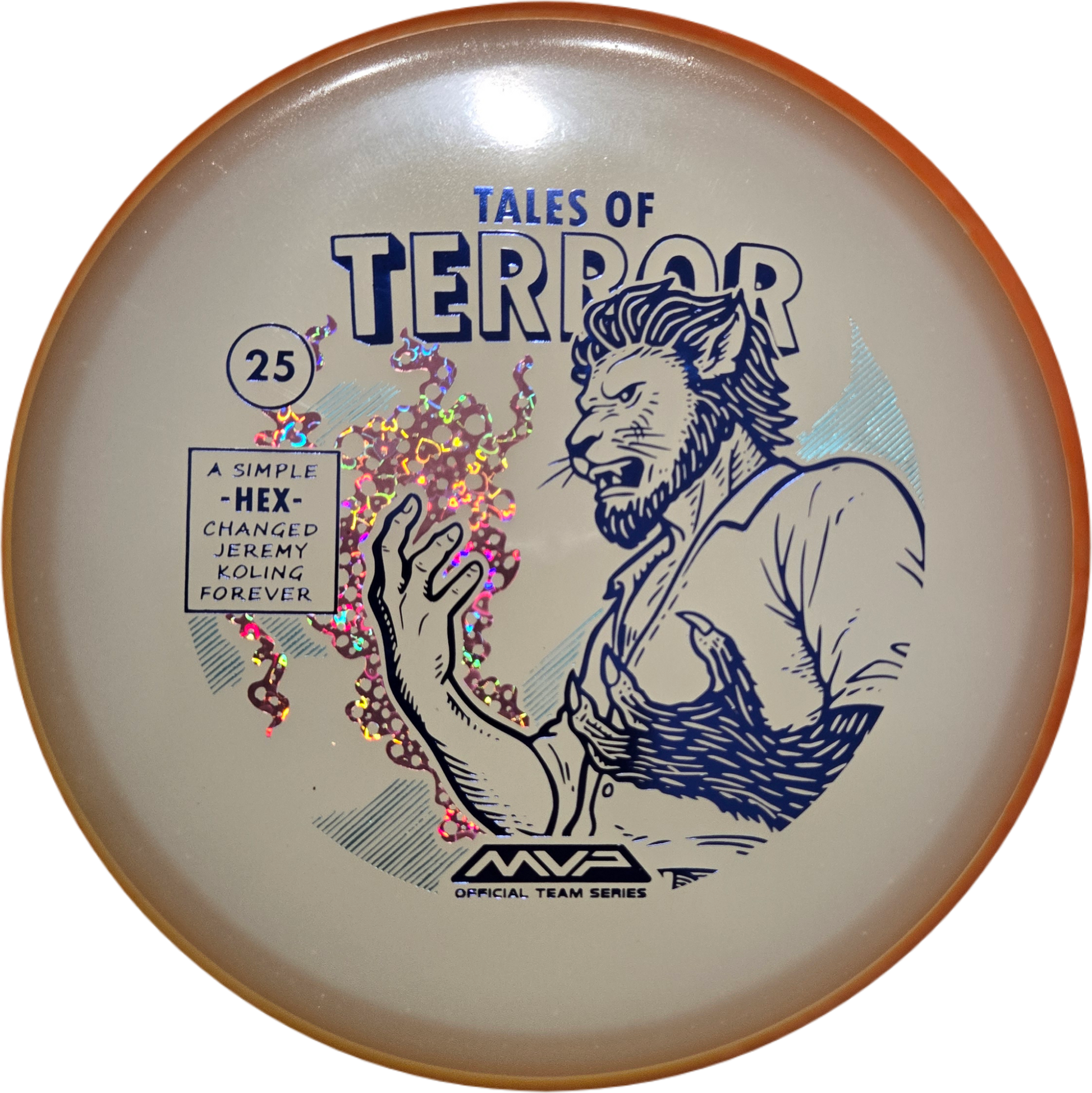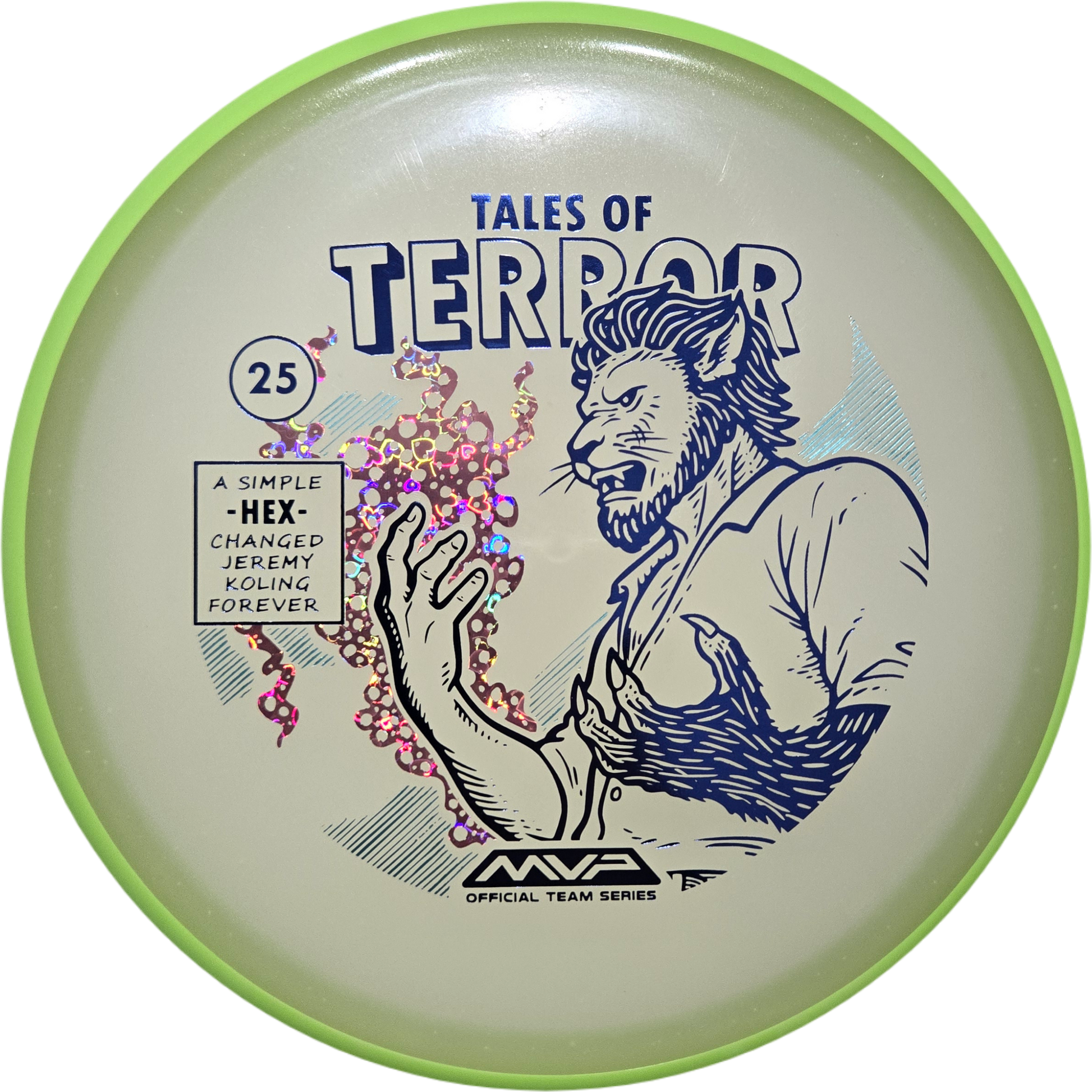 A short story from MVP: “DoubleRam Design shows us the terrifying alternate origin of Jeremy Koling’s childhood nickname – Lionheart – on the new Particle Eclipse Hex! Made with our industry-leading Eclipse plastic, this new blend of glow with colorful particles inside gives the disc its own magical feel. As a straight flying midrange, the Hex is set to become even more mesmerizing than before with its straight to understable flight allowing for exceptionally easy line shaping – showcasing why the Hex is one of the most versatile discs around. Unleash your inner beast and shred the course with the Particle Eclipse Hex, available at your favorite local or online MVP dealer!”