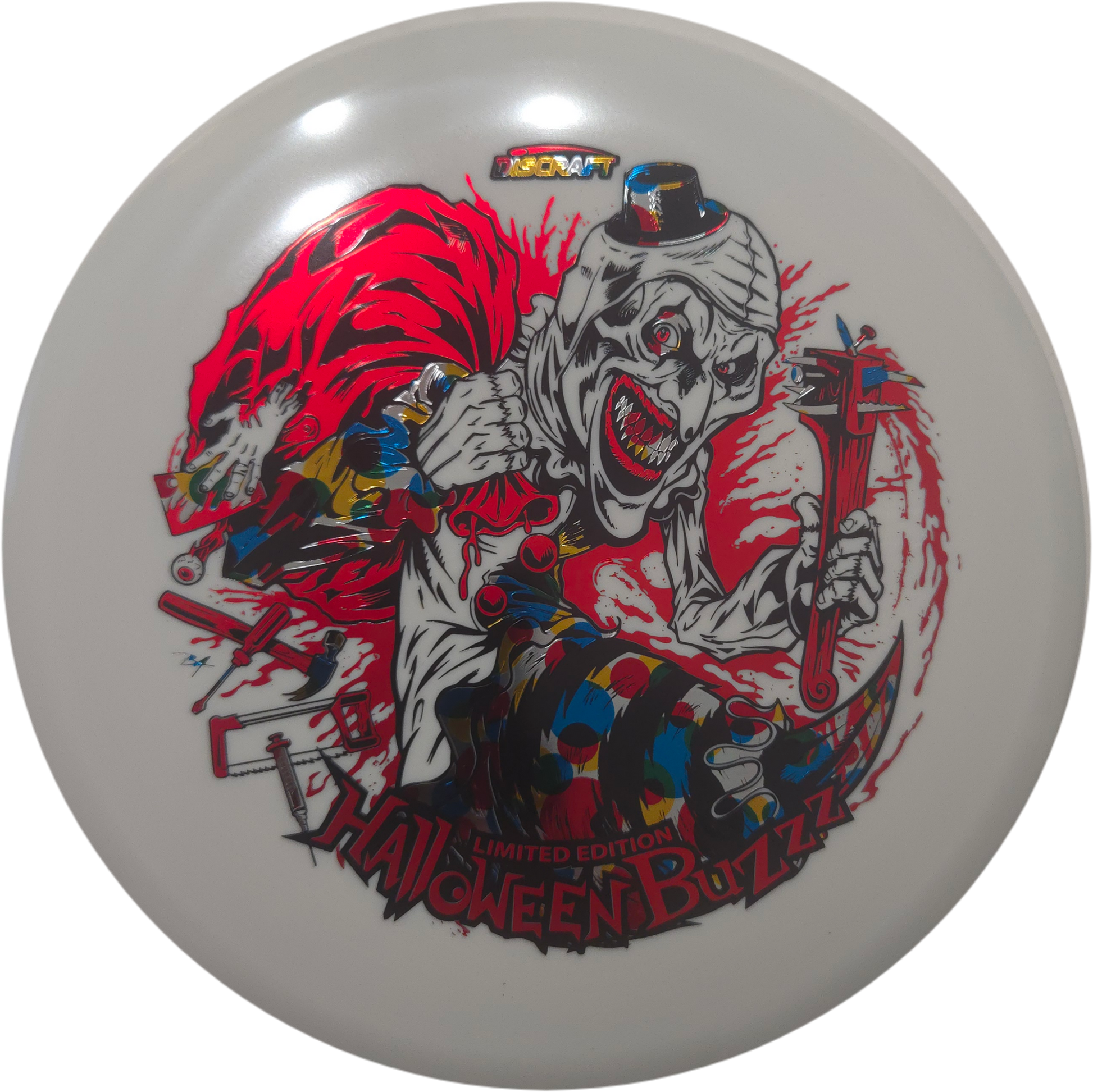 Under the glow of night, the 2025 Tri-Foil Glo Halloween Buzzz emerges from the shadows. An ominous clown silhouette peers from layered foils, casting an eerie shimmer across our classic glow plastic. Precision flight meets bone-chilling style, making this run as haunting in the air as it is on display.